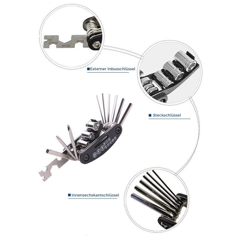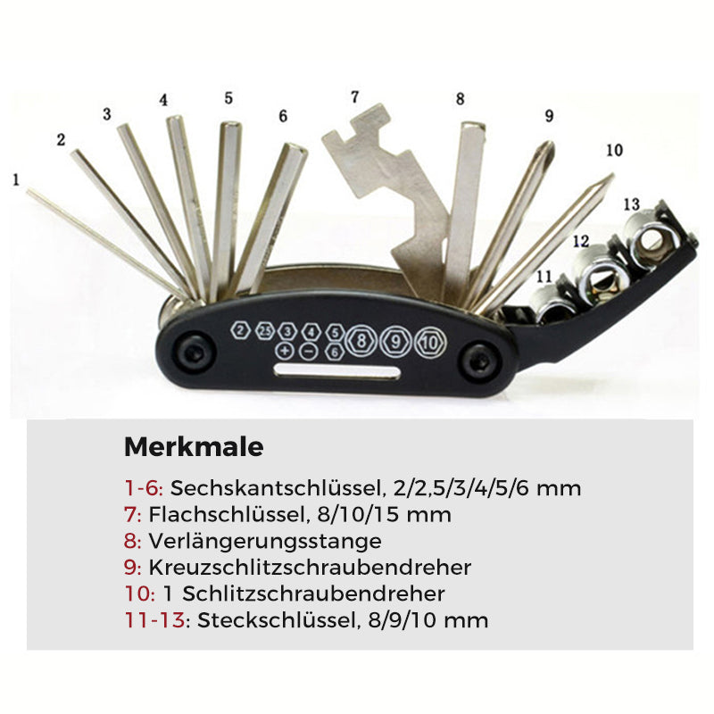 Das 16-in-1 Chrome Multi-Tool enthält 16 verschiedene Werkzeuge. Es kann verwendet werden, um fast alles in Ihrem Leben zu reparieren. Diese sechzehn Werkzeuge sind geschickt zusammengestellt. Sie können es jeden Tag in Ihrer Tasche tragen, anstatt sich nach mehreren Werkzeugen umzusehen. Sparen Sie Zeit und reduzieren Sie Kosten.