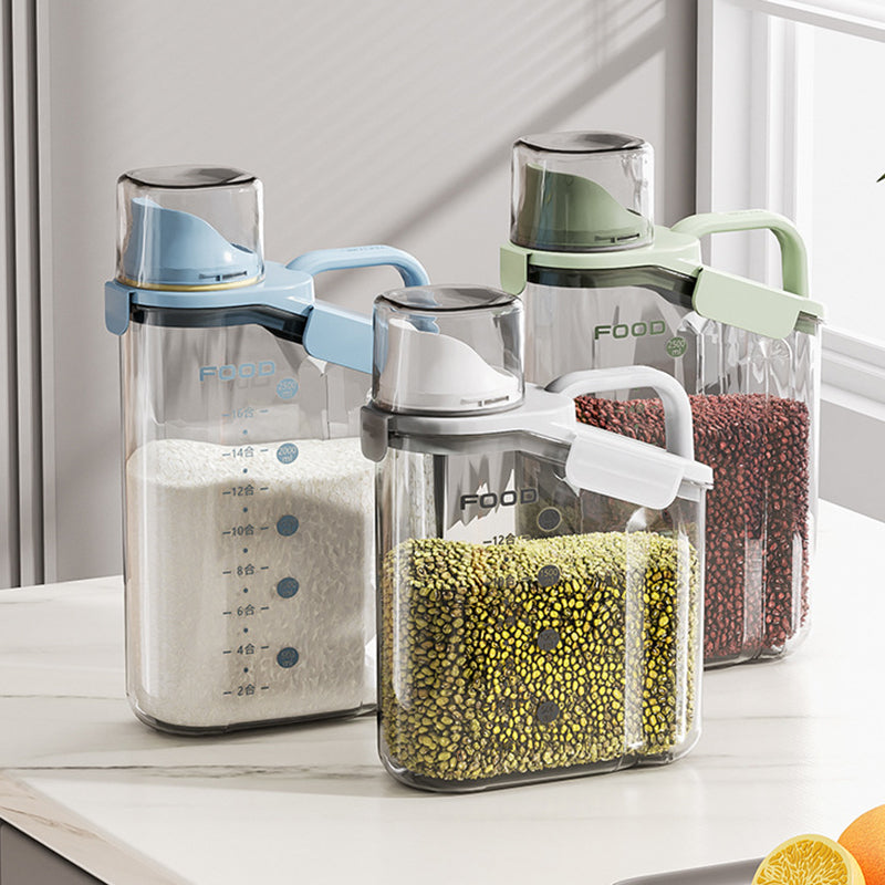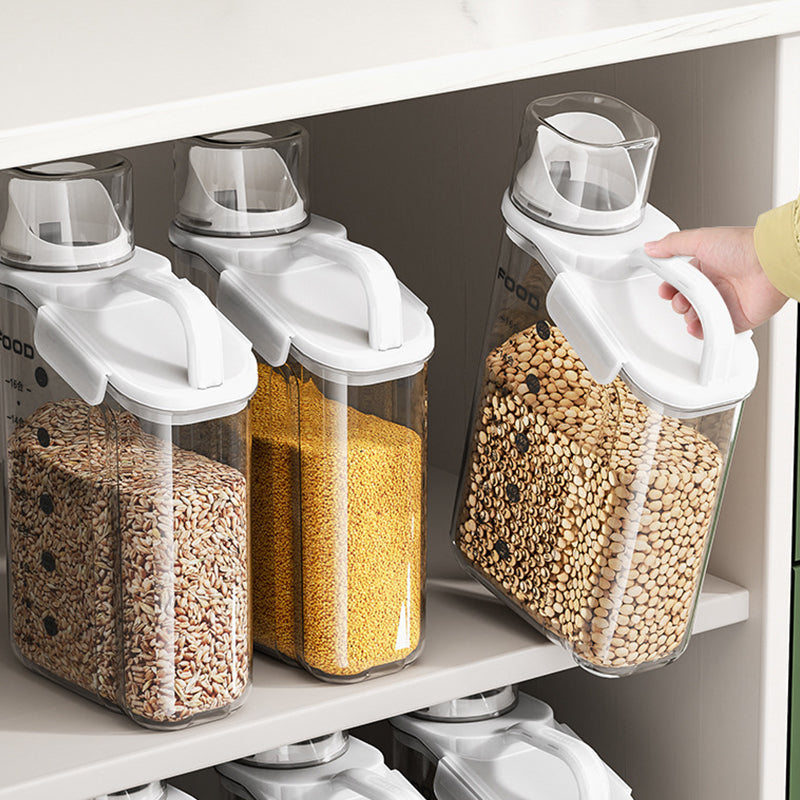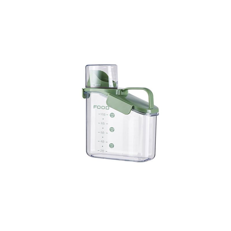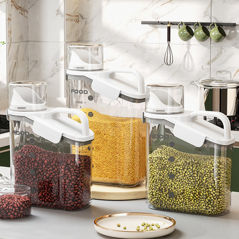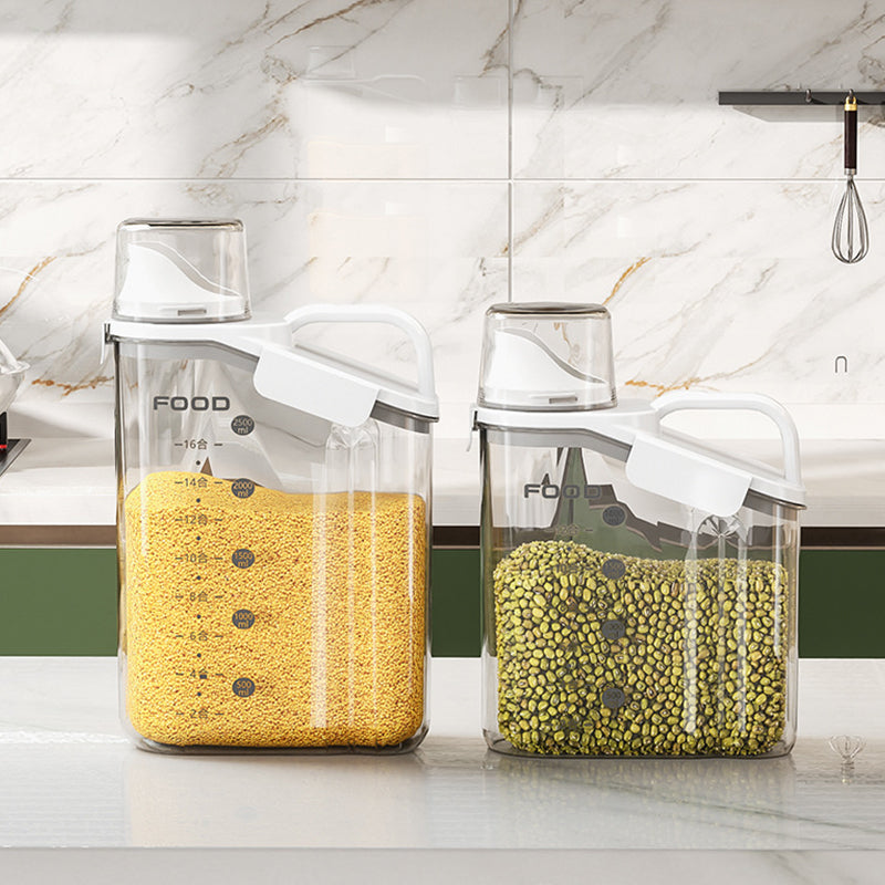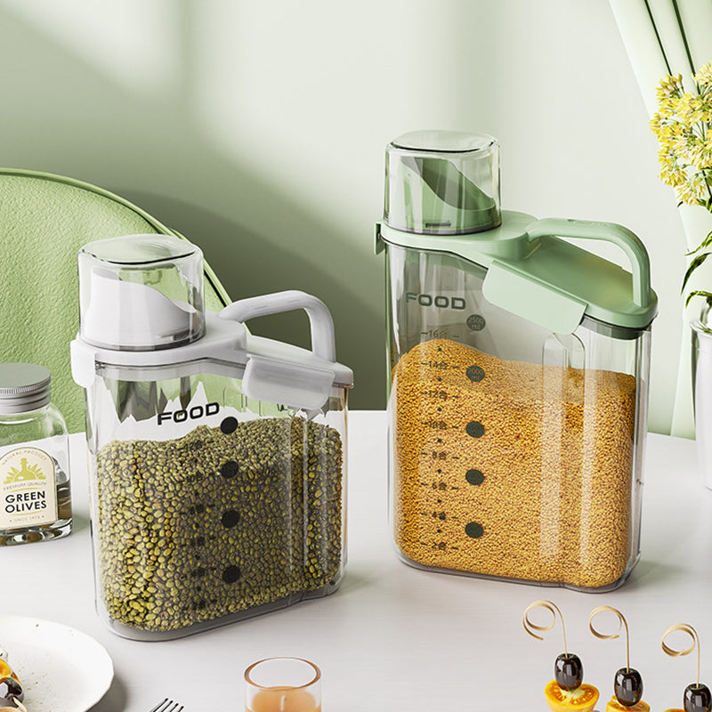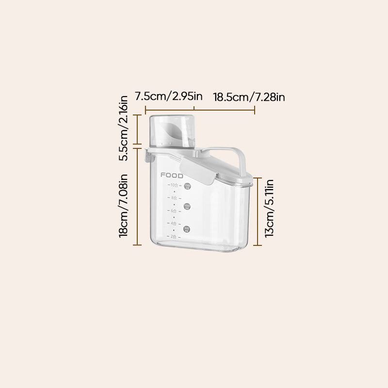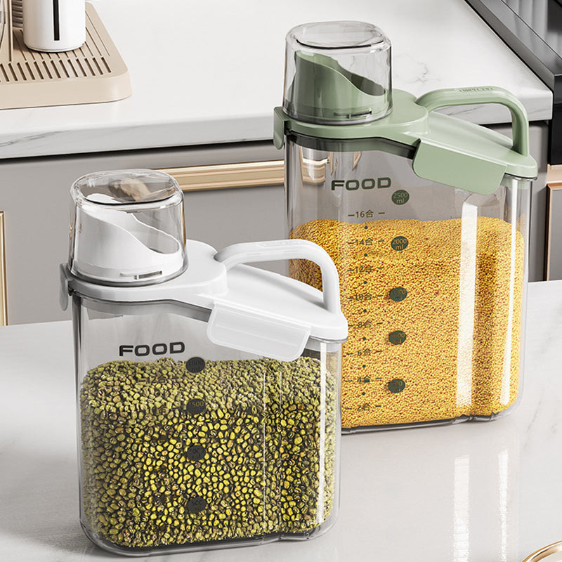 Dieser durchsichtige, luftdichte Behälter ist mit bequemen, ergonomischen Griffen und einem Henkel ausgestattet, sodass Sie ihn mühelos halten können. Außerdem ist dieser Vorratsbehälter mit einer Waage und einem Messbecher ausgestattet, sodass Sie jederzeit den Inhalt der Lebensmittel im Blick haben.