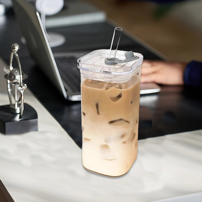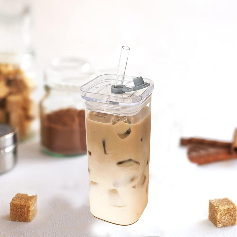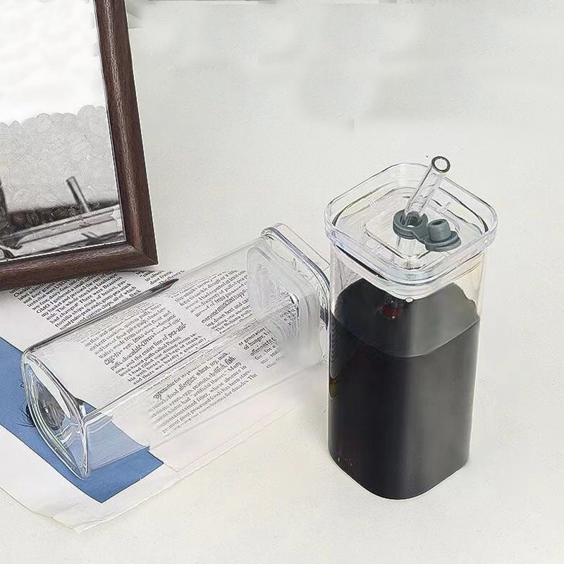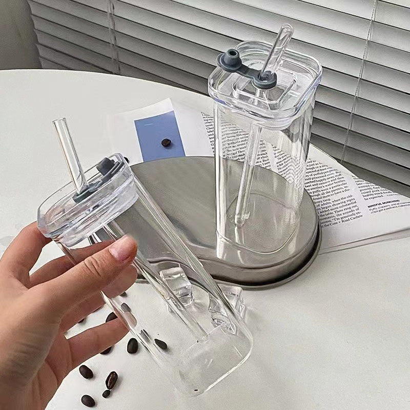 Quadratischer Trinkbecher mit Deckel und Strohhalm